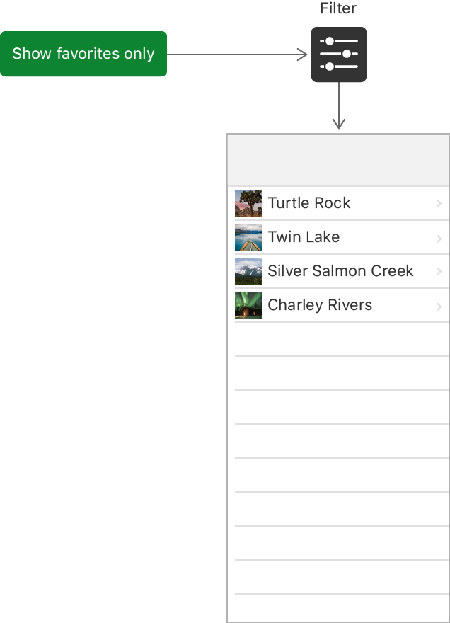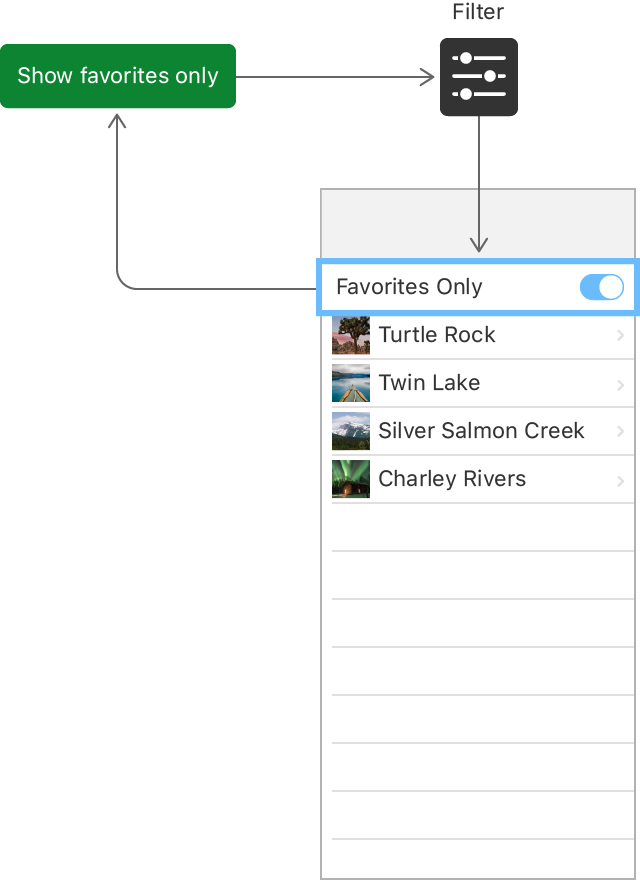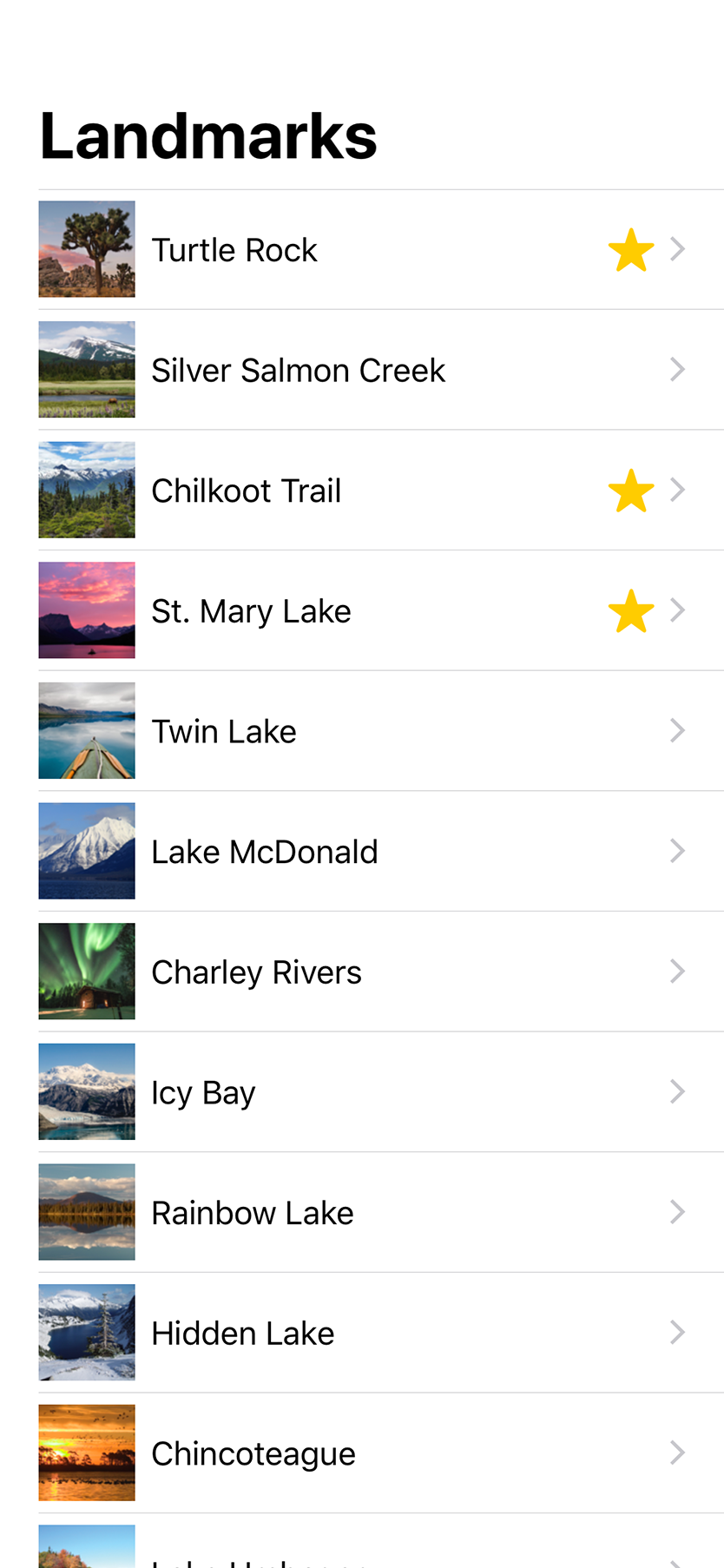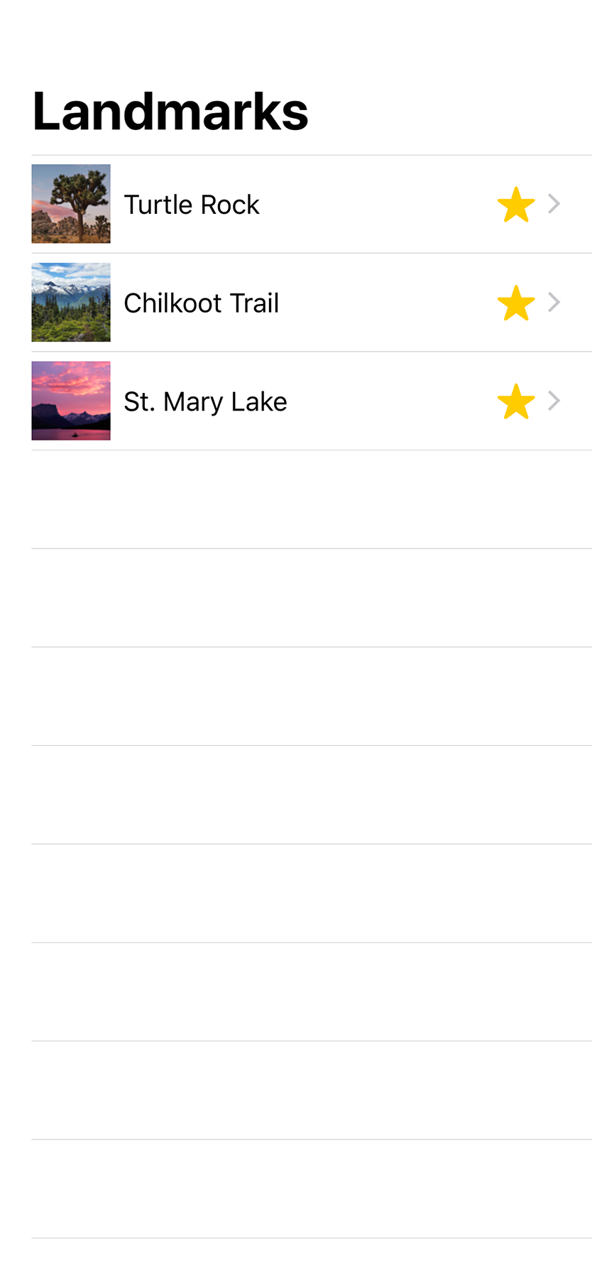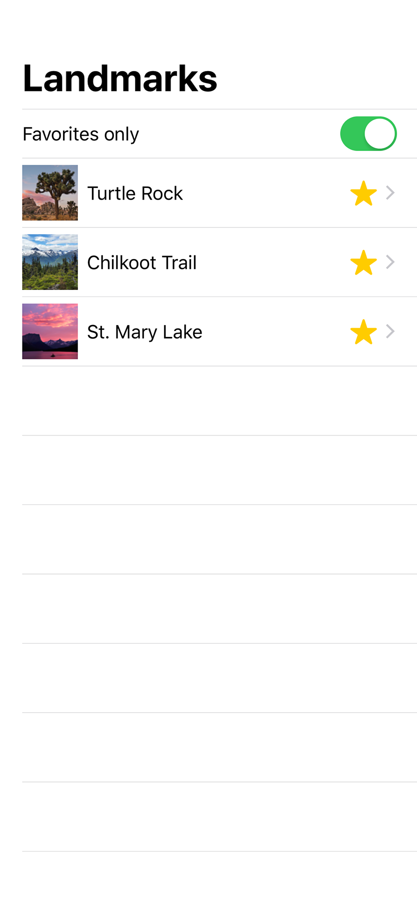 랜드마크(Landmarks) 앱에서, 사용자가 즐겨찾기 장소에 깃발을 달수 있고, 즐겨찾는 것들만 보여지도록 목록을 필터링 할 수 있습니다. 이 기능을 만들기 위해서, 여러분은 사용자가 자신이 즐겨찾는 것에 집중할 수 있도록 목록을 전환하는 것을 추가하는 것부터 시작하고, 사용자가 랜드마크를 즐겨찾기로 깃발을 지정하는 별표 모양의 버튼을 추가할 것입니다.