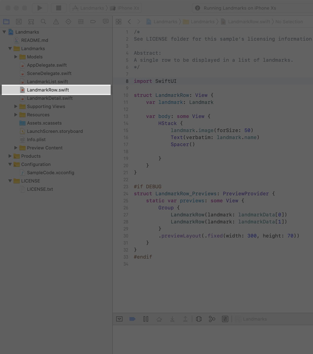 시작 프로젝트를 Xcode로 열고, 프로젝트 네비게이터에서 LandmarkRow.swift를 선택합니다.