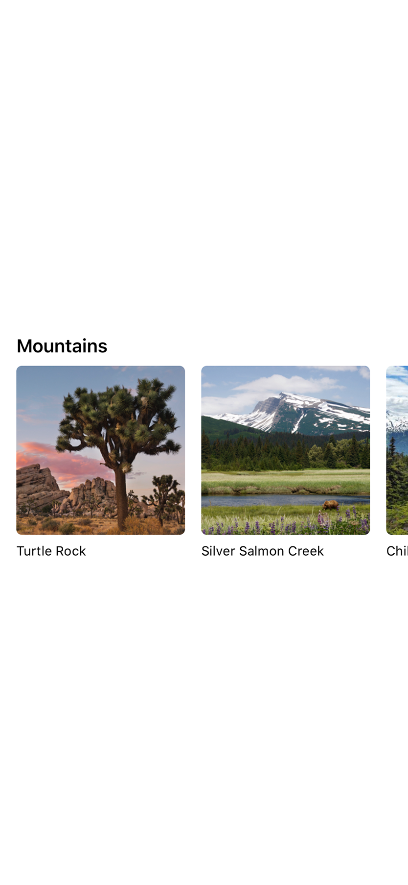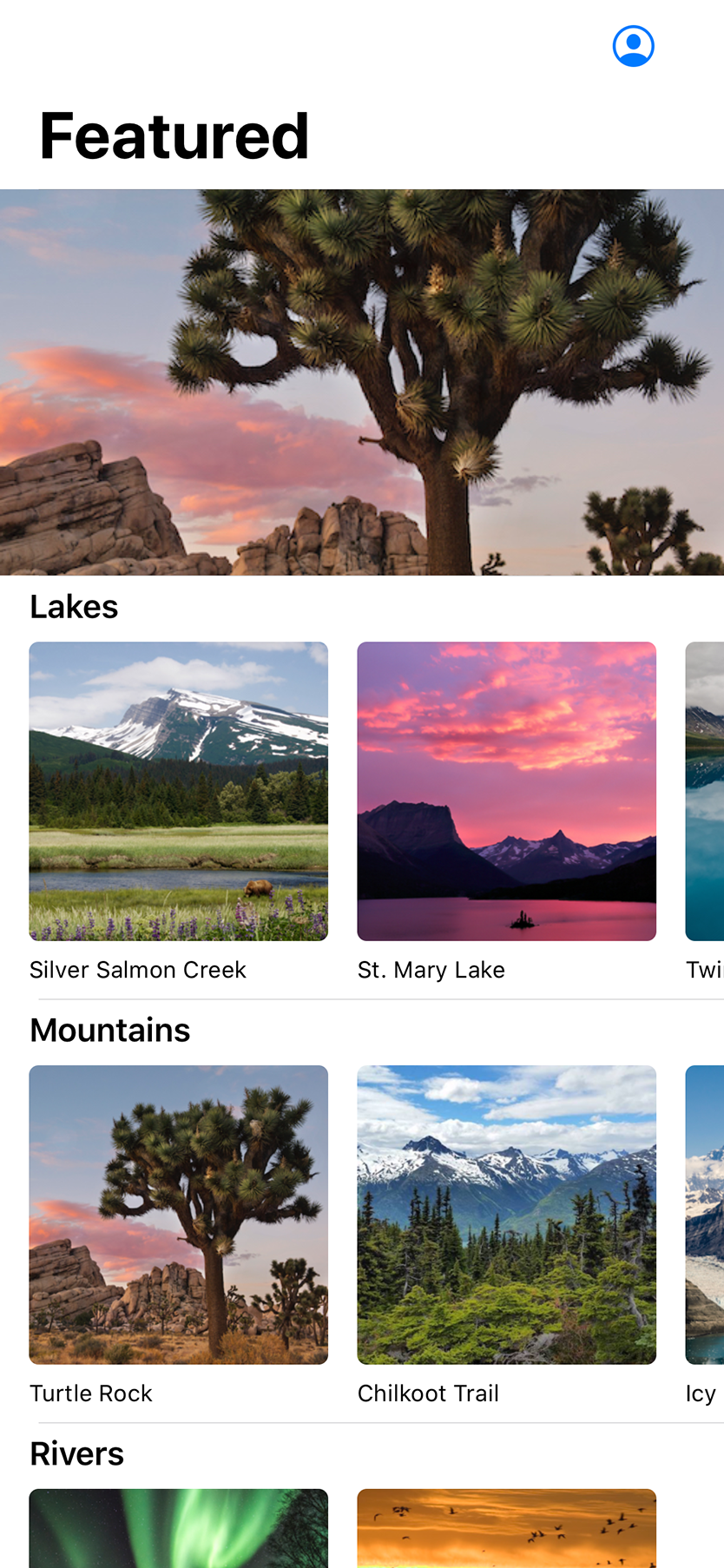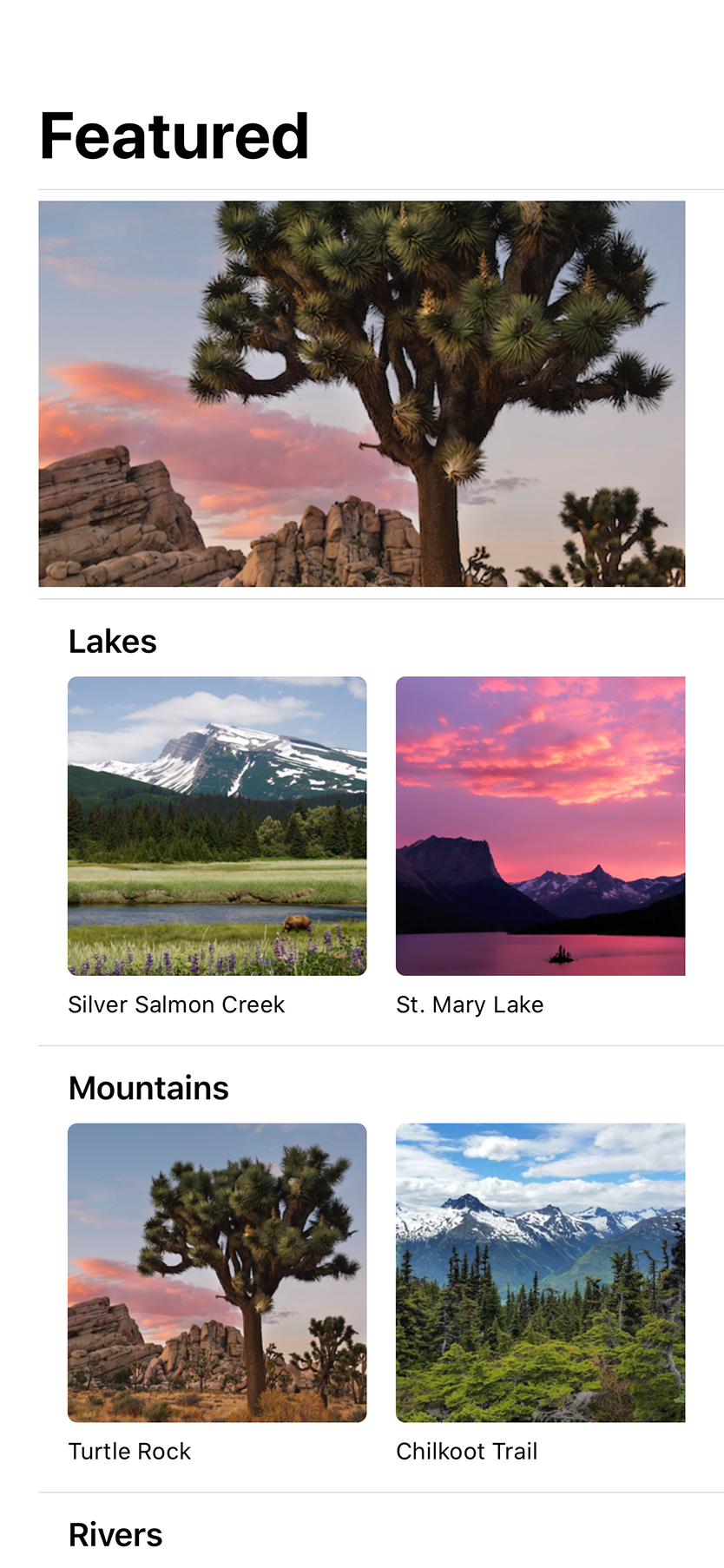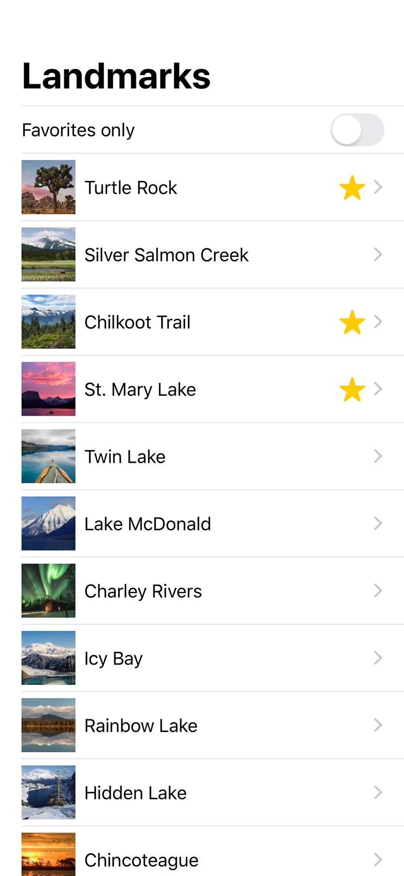 Landmark 앱은 모든 카테고리를 쉽게 탐색할수 있는 수직 열(column)으로 정렬된 별도의 행(row)으로 보여줍니다. 수직과 수평 스택으로 결합하고 목록에 스크롤을 추가하는 작업을 수행합니다.