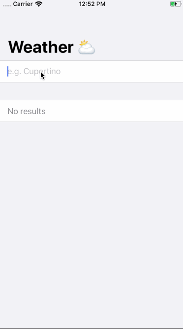 - 더 나은 사용자 경험을 제공하기 위해 debounce(for:scheduler:)을 사용합니다. 그것이 없다면 fetchWeather는 입력된 모든 문자에 대해 새로운 HTTP 요청을 만들것입니다. debounce는 사용자가 입력을 멈추고 마지막 값을 전달할때까지 0.5초 동안 기다리다가 동작합니다. 이 동작에 대한 훌륭한 시각화를 RxMarbles에서 볼수 있습니다. 또한 인자로 scheduler을 전달하는 것은, 특정 큐에서 모든 값이 내보내지는 것을 의미합니다. 경험상(Rule of thumb), 백그라운드 큐(background queue)에서 값을 처리하고 메인 큐(main queue)에 전달해야 합니다.