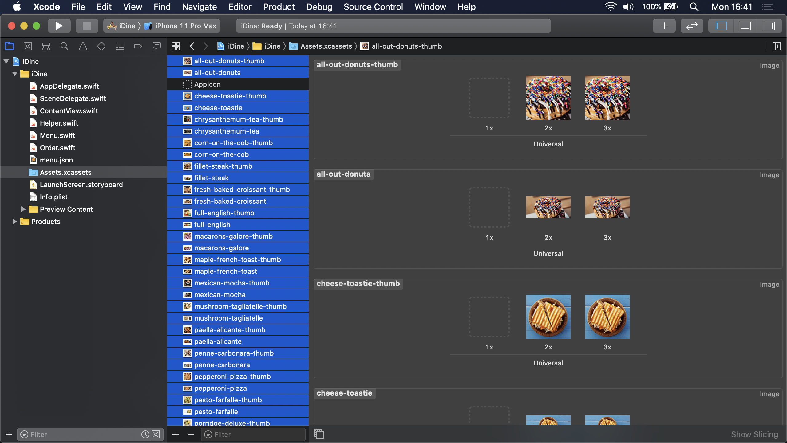 - 이미지 디렉토리의 컨텐츠들을 asset catalog로 드래그해서, 우리가 필요한 사진 모두를 가지고 있습니다.