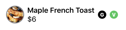 menu.json을 보면 각 메뉴 항목에 제한된(restrictions) 문자열 배열이 었는 것을 알수 있습니다: 글루텐 함량에 대해 G, 견과류 함량에 대해 N, 채식을 위한 V, 등등. 이를 사용해서 음식의 내용을 한눈에 볼 수 있는 색상 아이콘을 만들 수 있고, 각 행마다 적절하게 0개 이상을 보여줄 수 있습니다.