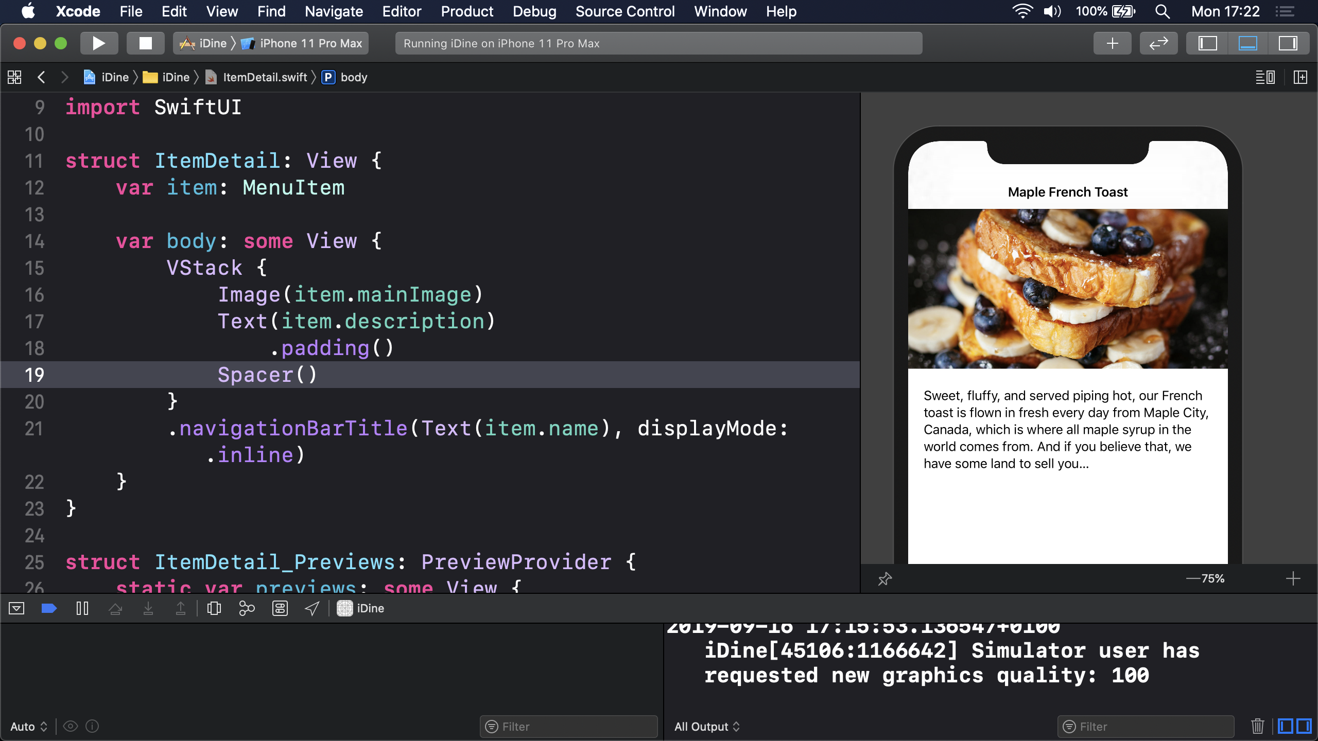 물론, 더 많은 것을 원합니다 - 멋진 큰 그림, 음식에 대한 세부사항, 등등. 새로운 SwiftUI 뷰를 만들기 위해 Cmd+N을 누르고 ItemDetail.swift라고 입력합니다.