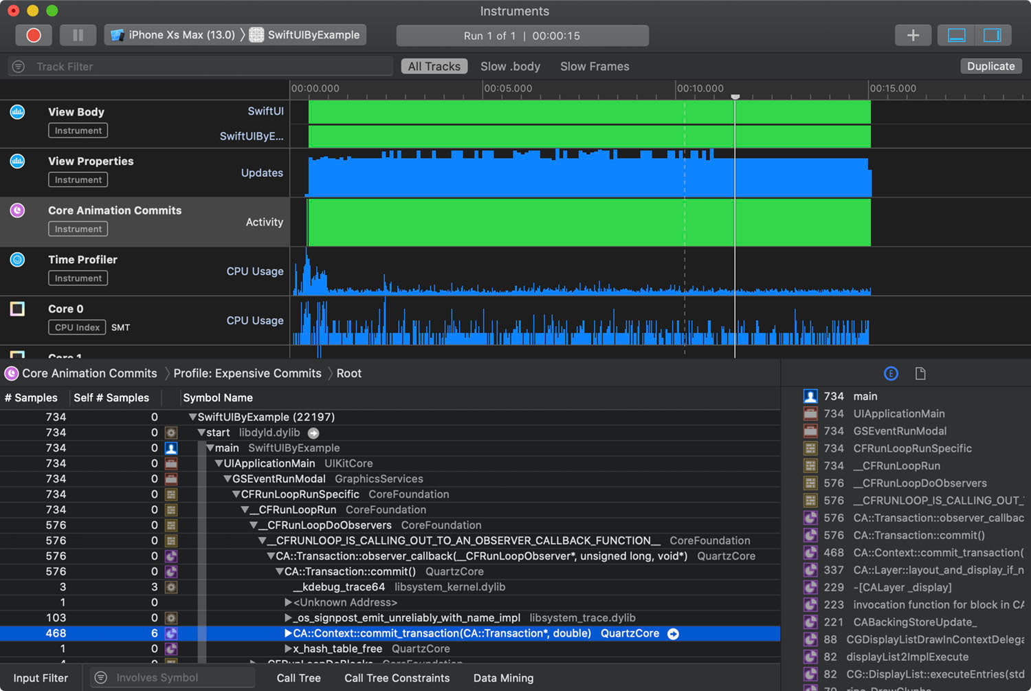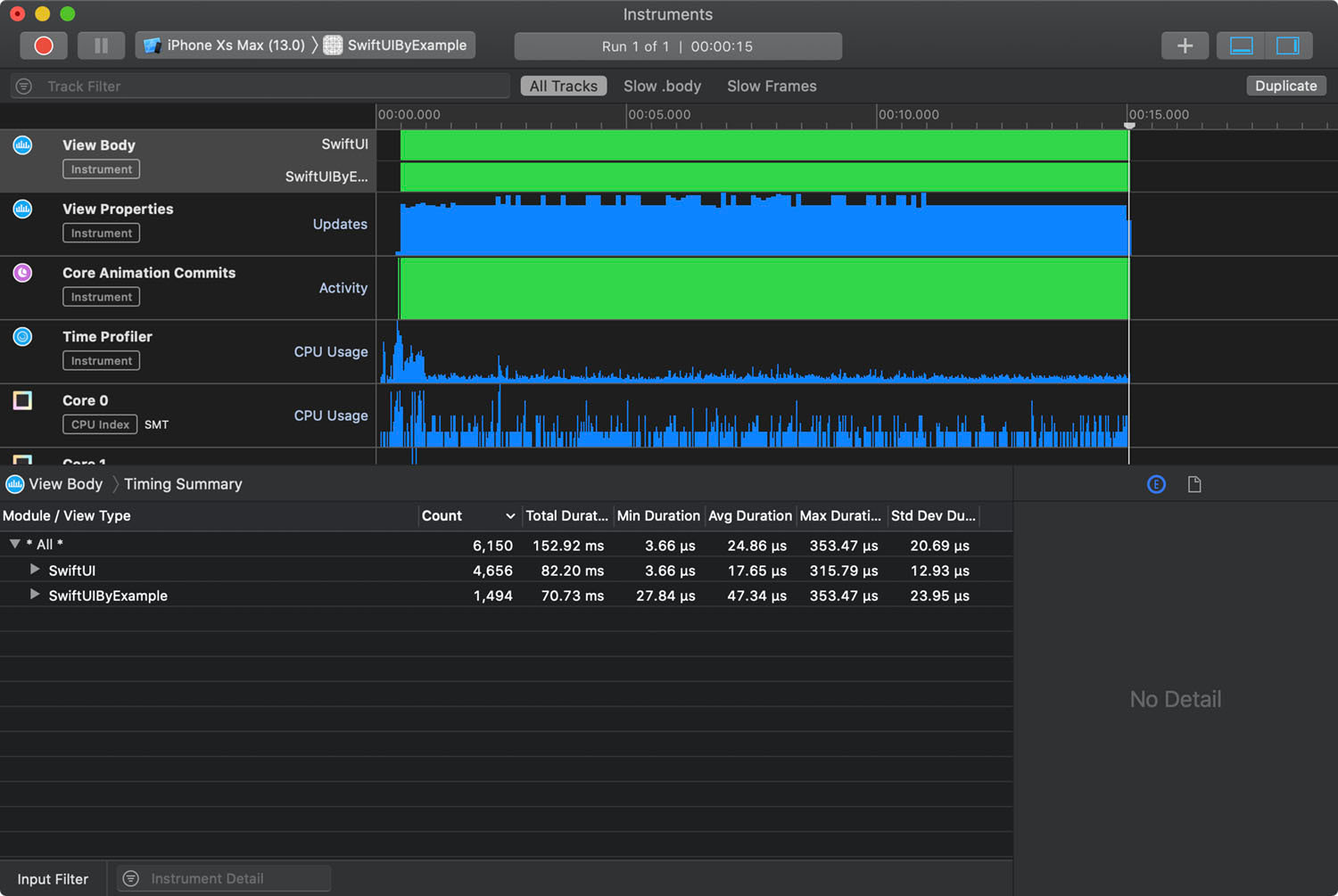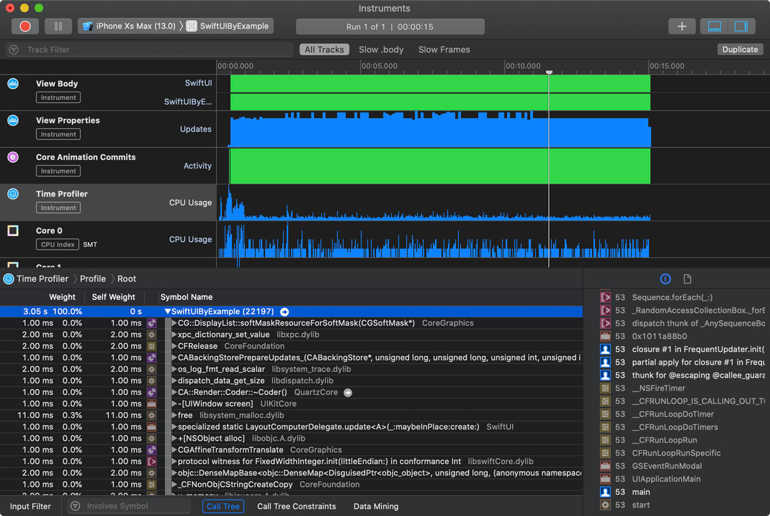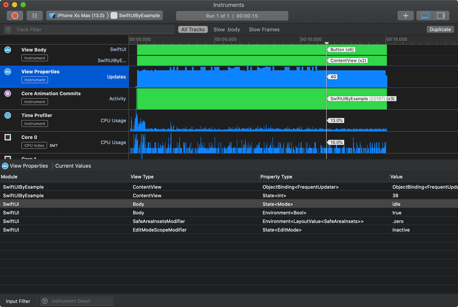 기본적으로 SwiftUI instrument는 다양한 것들을 알려줍니다: