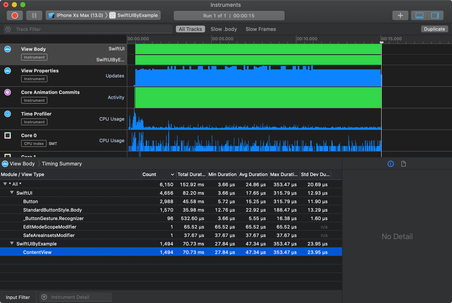 View Body 트랙을 선택하는 경우(instruments의 목록에서 첫번째 행입니다) Instruments가 그 결과를 SwiftUI와 프로젝트의 분해하는 것이 가능하다는 것을 알 수 있어야 하며, 전자(former)의 경우에는 텍스트 뷰나 버튼과 같은 기본 타입이 되고, 후자(latter)는 사용자정의 뷰 타입을 포함합니다. 우리의 경우에, 뷰의 이름이기 때문에, 사용자정의 뷰에 ContentView가 나타나야 하는 것을 의미합니다.