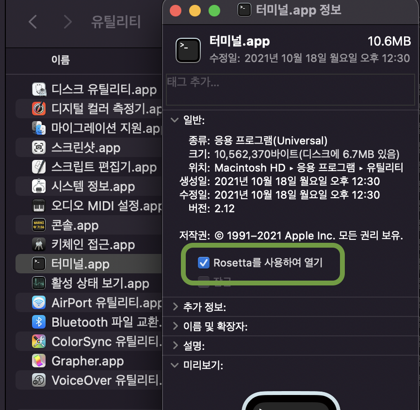 이럴때 터미널 앱 속성에서 'Rosetta 사용하여 열기'를 체크하는 것으로 해결할수가 있습니다.