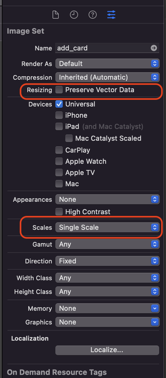 Xcode에서 사용가능한 벡터 이미지는 PDF 파일과 SVG 파일이 있으며, 사용 조건은 다음과 같습니다.
