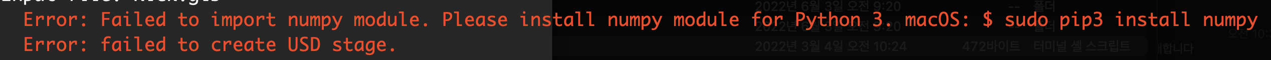 만약 numpy가 설치 되어 있지 않은 경우에는 "Error: Failed to import numpy module. Please install numpy module for Python 3. macOS: $ sudo pip3 install numpy Error: failed to create USD stage." 메시지를 보게 됩니다.