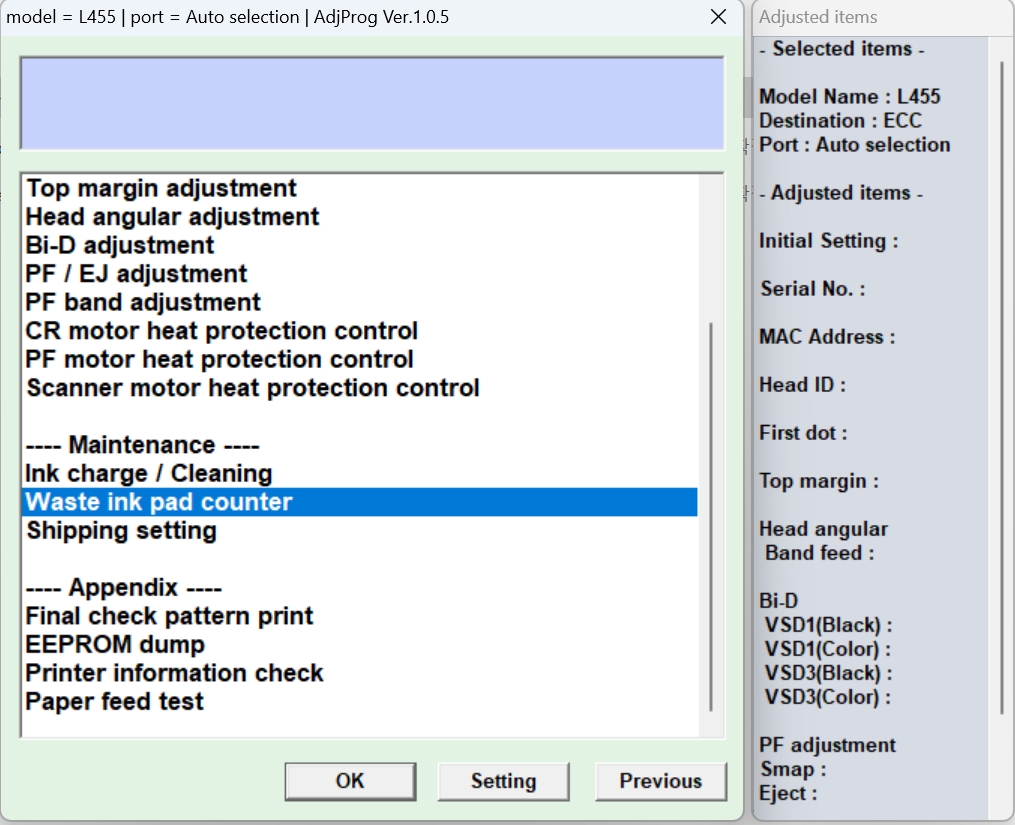 6. 목록중에 Wast ink pad counter 를 선택하고 OK 버튼을 누릅니다.