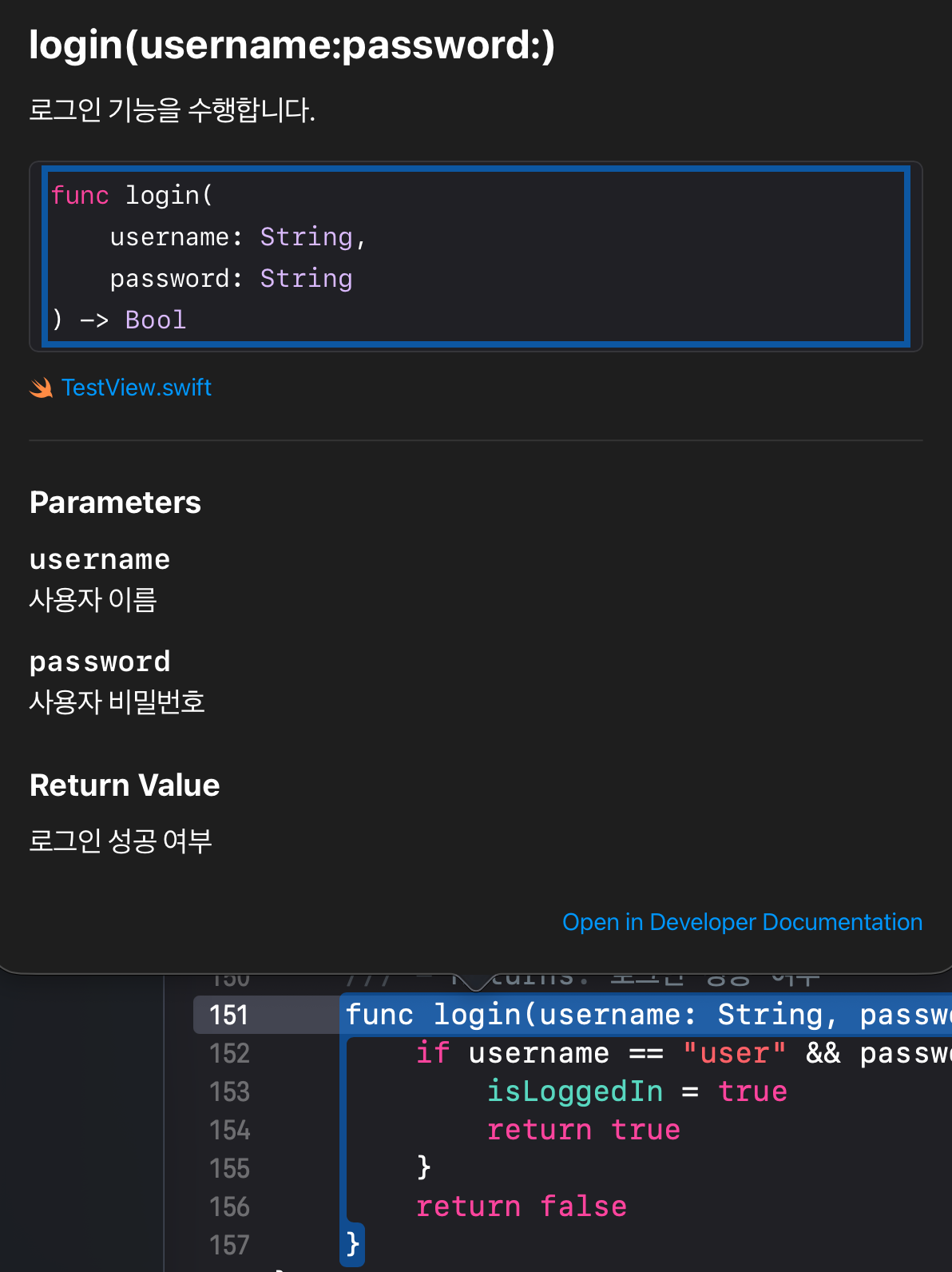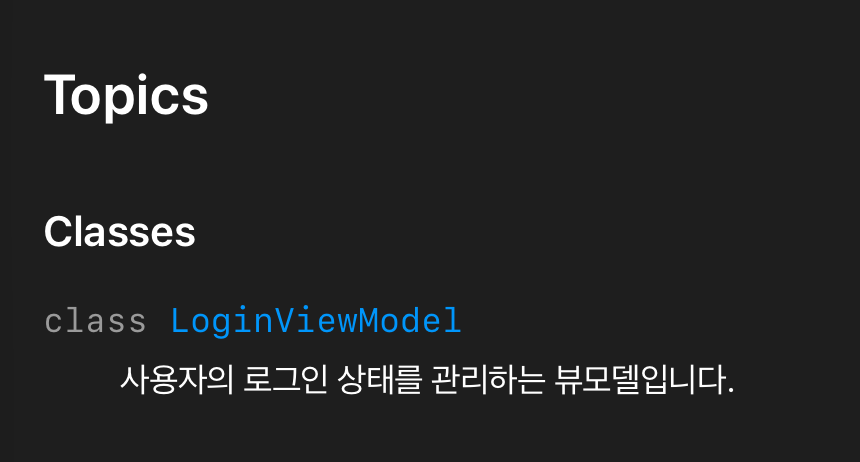 문서 생성전에 확인해 보려면 LoginViewModel 클래스에서 마우스 올려놓고 Option(Alt) + 마우스 왼쪽 클릭 하면 다음과 같은 화면을 볼수 있습니다.