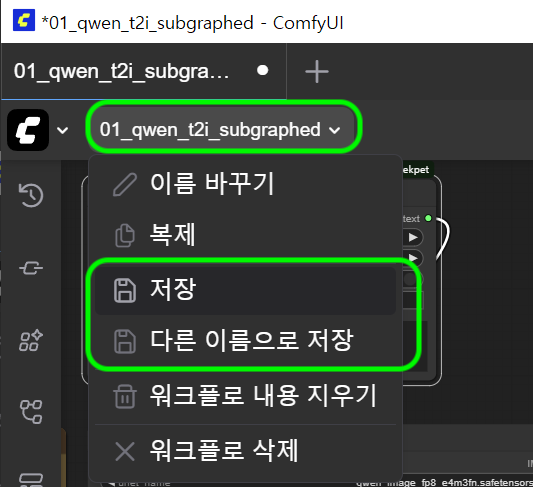 1. 워크플로를 저장하려면 상단의 탭영역을 눌러서 저장 또는 다른 이름으로 저장을 눌러주세요.