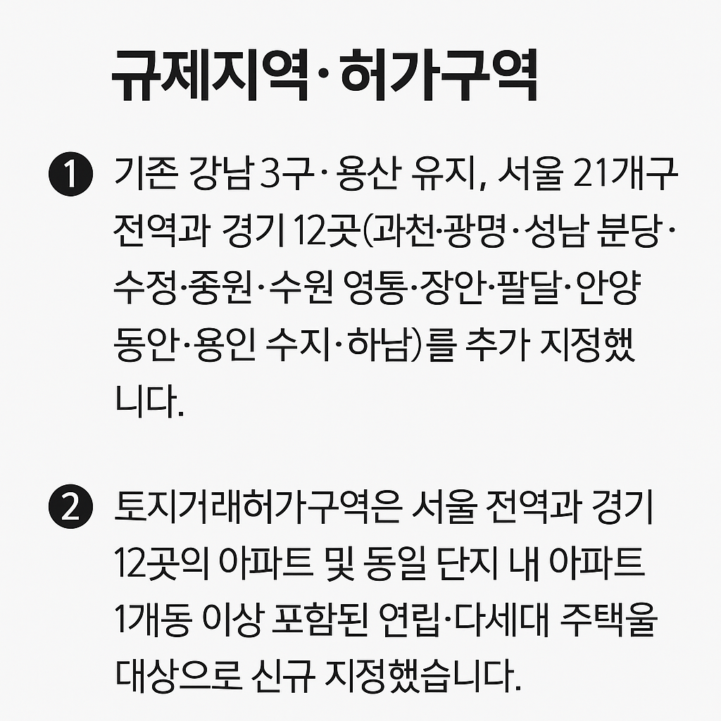 | 조정대상지역 / 투기과열지구 | 서울 전역, 경기 12개 지역(예: 과천·광명·용인 등) 등 지정 | 전매 제한·거주 요건 강화·세제 부담 증가 |