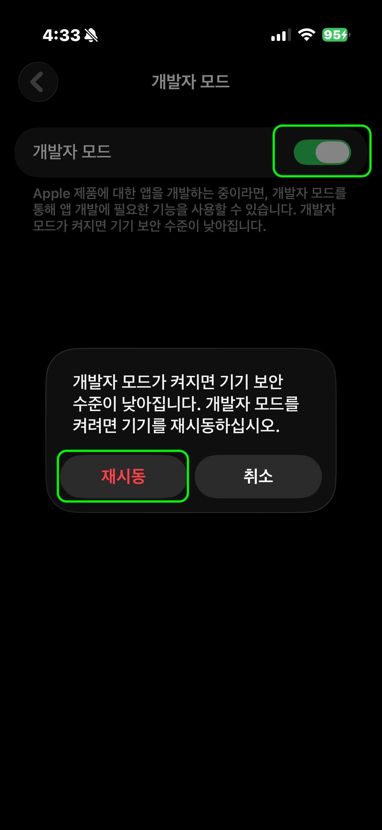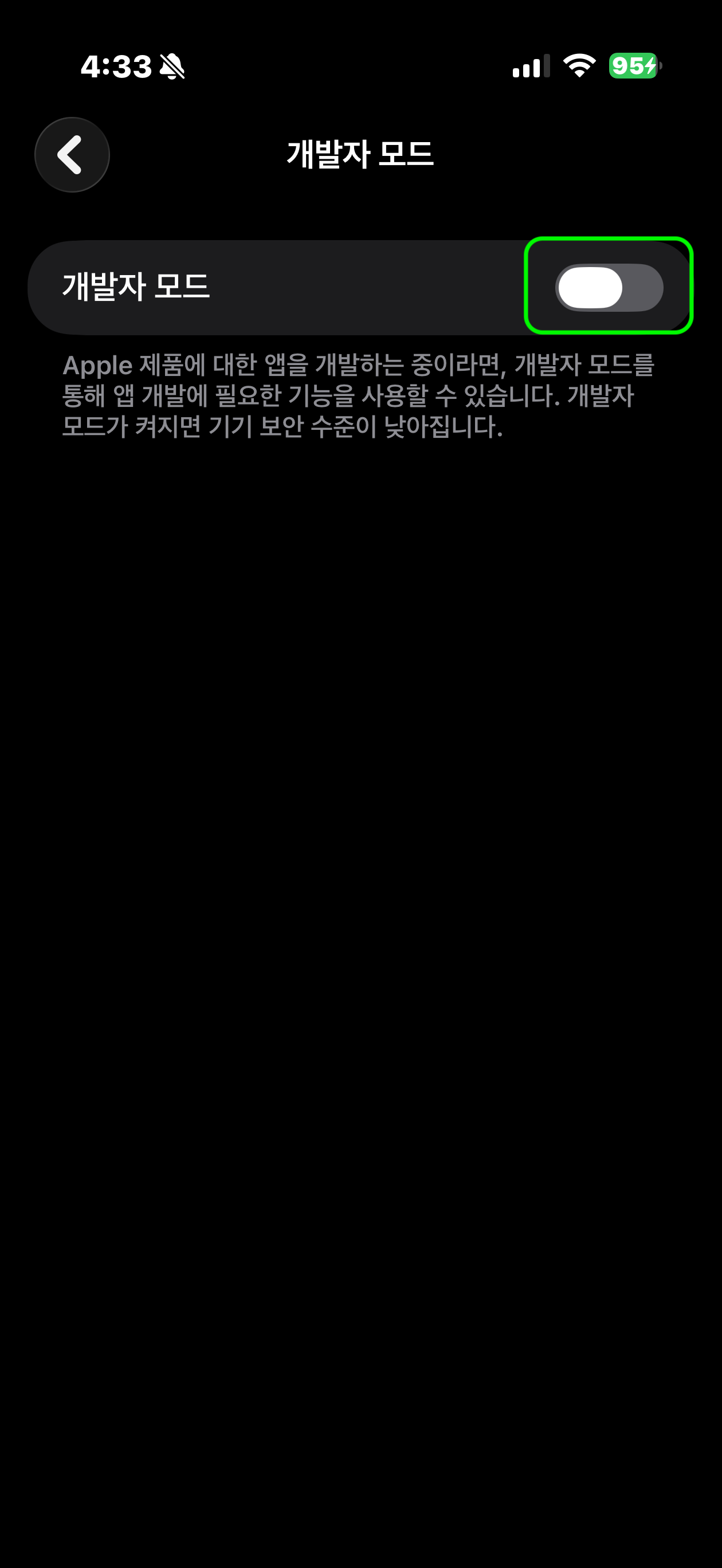 - TestFlight가 아닌 개발 서명 앱(Development/Ad Hoc) 을 설치/실행하는 과정에서 Developer Mode 요구가 발생할 수 있습니다.