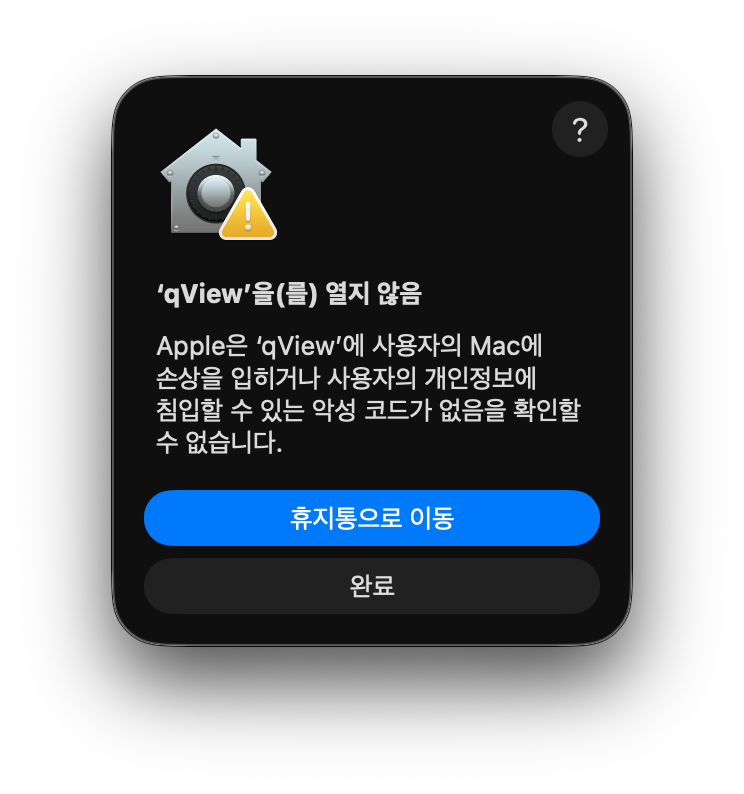 Gatekeeper는 Apple이 서명하지 않았거나, 공증(Notarization)되지 않은 앱의 실행을 기본적으로 차단하는 보안 기능입니다.