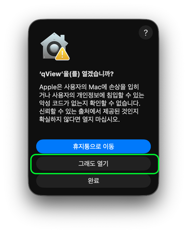 외부에서 다운로드한 앱을 실행할 때 아래와 같은 메시지를 보셨다면 Gatekeeper에 의해 차단된 상태입니다.